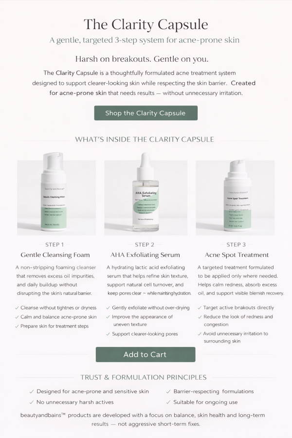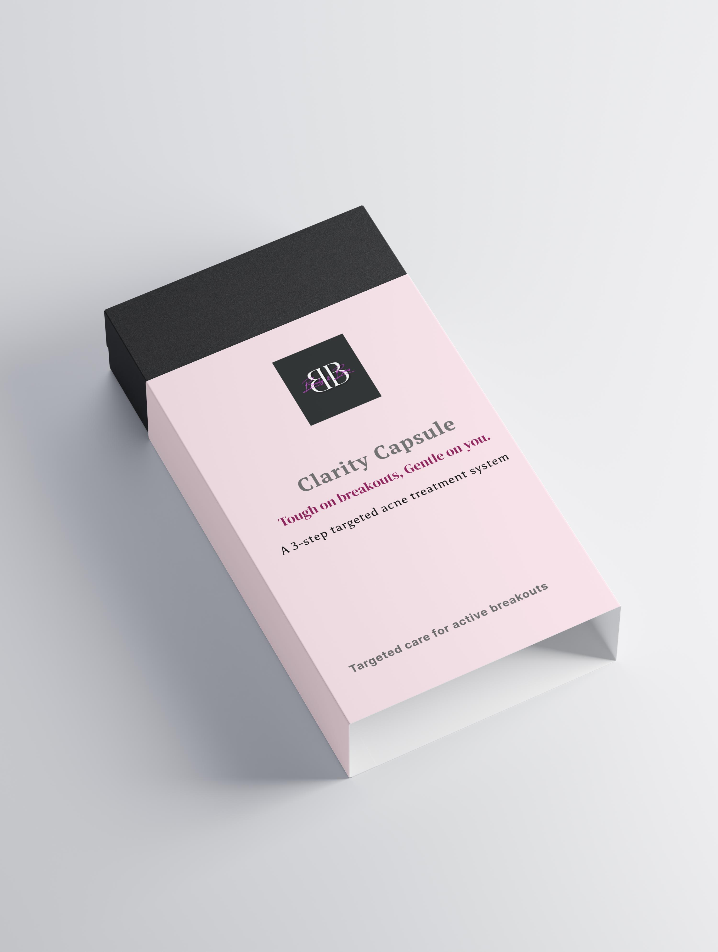 Many acne treatments rely on aggressive actives that strip the skin, compromise the barrier, and often worsen sensitivity over time.The Clarity Capsule takes a different approach.By combining gentle cleansing, controlled exfoliation, and targeted treatment, this system works with your skin — helping to calm breakouts while supporting balance, comfort, and resilience.