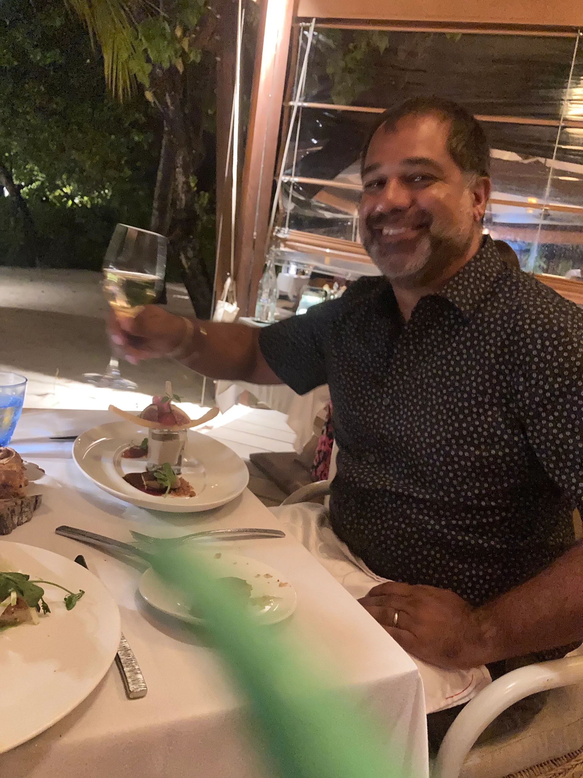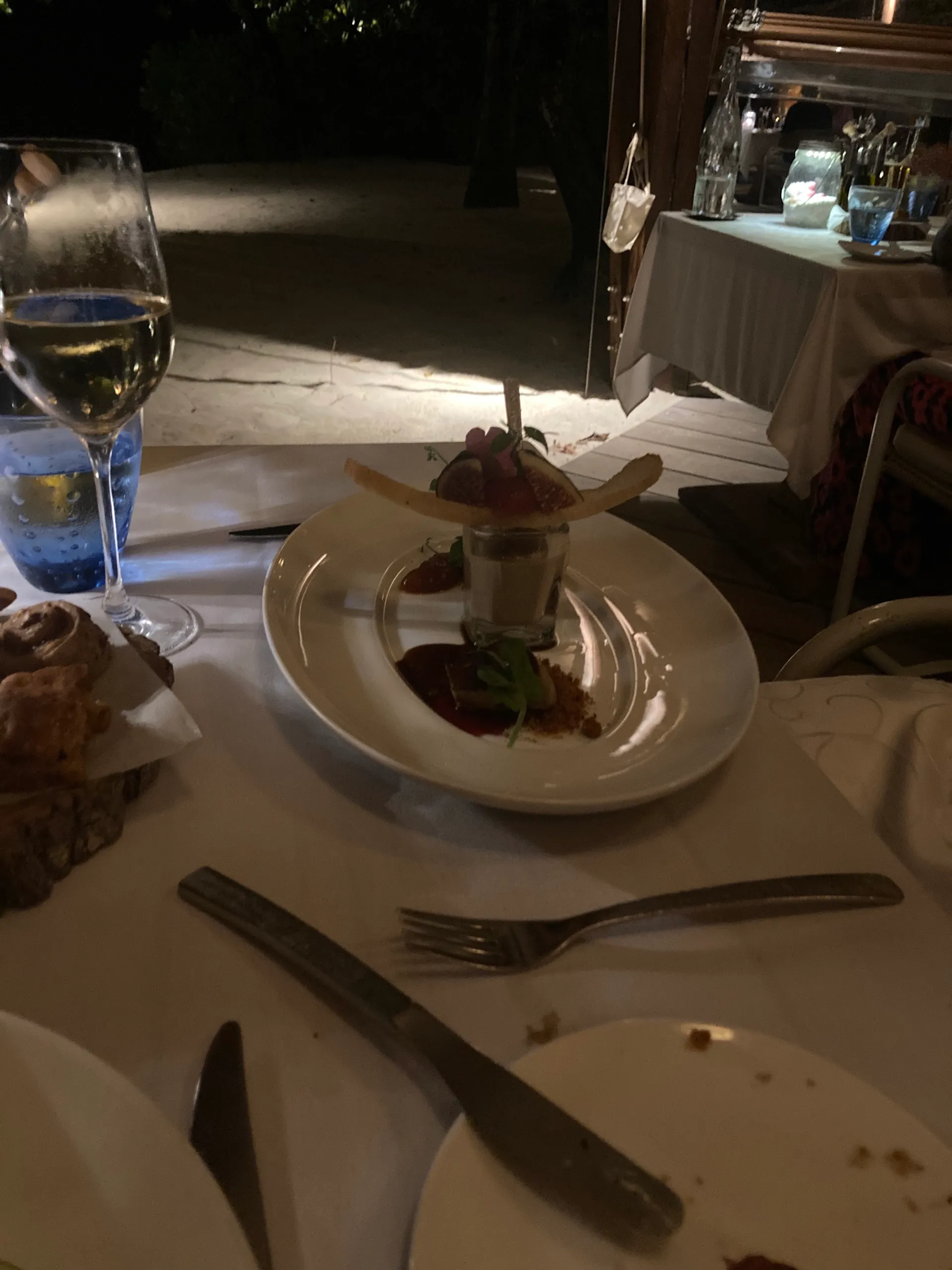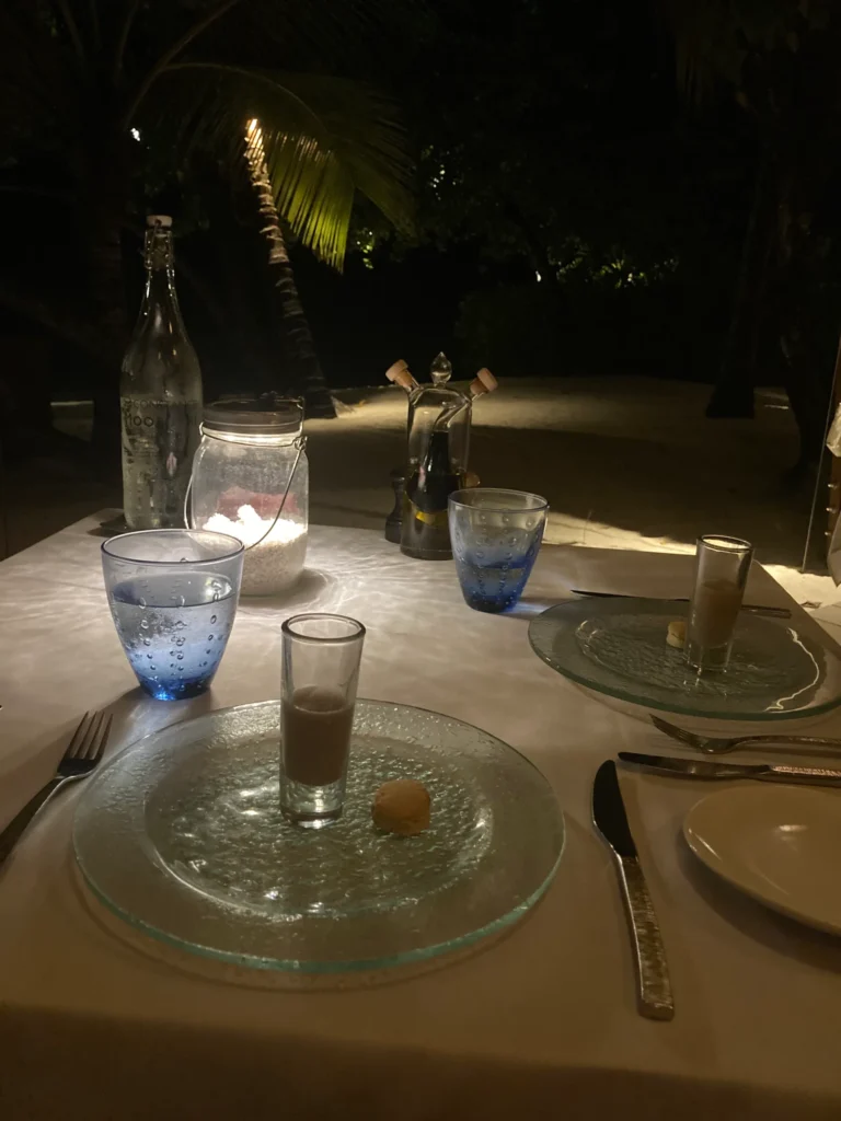 Constance Moofushi Resort has only 2 full restaurants (and a little beach restaurant that you can get lunch from ) Now I know what you may be thinking “just 2 restaurants?”. When we first arrived, that’s what I thought. I was a bit concerned that we would get bored with the same food every day for 10 days (can you imagine ?), but the food was delicious every night. The main restaurant serves breakfast and dinner daily. Breakfast is the spread you would expect from a 5 star resort, everything from eggs (any which way you want it), pancakes, cakes and bakes to the full English. Dinner is themed every night so you can expect Indian, seafood, Maldivian and everything else and they are ALL absolutely delicious. Amazing food and great variety. Lunch can be found at the beach bar restaurant. They have a small menu but really tasty (the burgers were really good ). The other full restaurant is the Alizee restaurant. Alizee is a slightly more upmarket, “dress up and enjoy 5 star cuisine” type of vibe. It has an a la carte menu and a fantastic wine list with incredible wines from around the world including South Africa (which imo has some of the best wine in the world). Like everything on the island, there’s an ocean view 🙂 The menu consists of dishes like leg of lamb, foie gras for starters (Mike’s favourite) and creme brûlée (my fave). I can’t describe adequately how delicious the food is so iv taken a whole lotta pics for you guys(obvs:)) Ps. the bread at Alizee is just so good. It’s served with truffle butter and slow roasted garlic. Just divine.